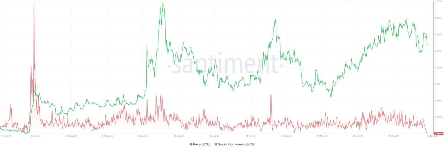 Chỉ số Thống trị Xã hội (Social Dominance) của Santiment cho BCH cho thấy triển vọng tiêu cực của đồng tiền này. Chỉ số này đo lường tỷ lệ thảo luận liên quan đến BCH trên các phương tiện truyền thông tiền điện tử . Chỉ số này đã giảm từ 0,76% vào ngày 25 tháng 10 xuống còn 0,15% vào thứ Ba, mức thấp nhất trong năm nay và là mức thấp nhất kể từ tháng 7 năm 2023. Sự sụt giảm này cho thấy sự quan tâm của nhà đầu tư đang giảm sút và sự tham gia của cộng đồng vào Bitcoin Cash cũng giảm sút.