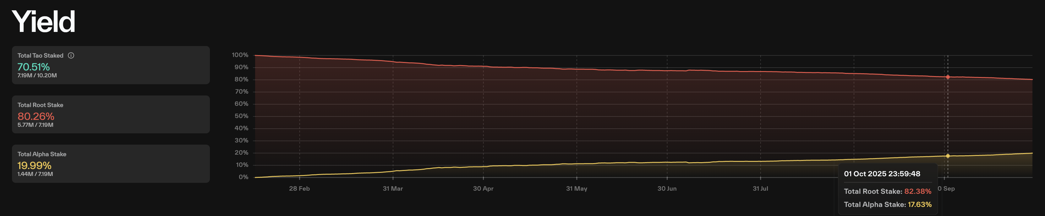 Nhu cầu về token alpha với lợi suất cao hơn TAO phản ánh sự gia tăng khẩu vị rủi ro của người dùng. Tính đến thứ Năm, trong số 7,19 triệu TAO được staking, 19,99% (1,44 triệu) token đã được hoán đổi sang token alpha, tăng từ mức 17,63% vào ngày 1 tháng 10.