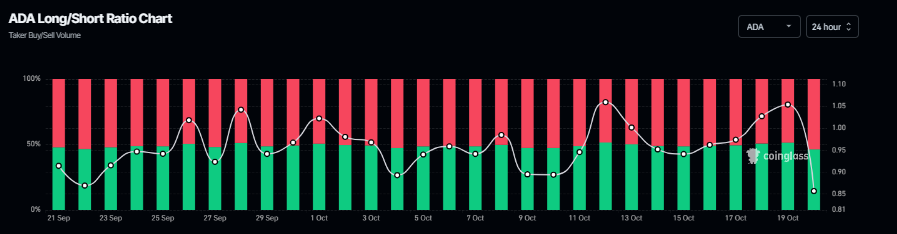 Tỷ lệ mua/bán ADA của CoinGlass , hiện ở mức 0,85, là mức thấp nhất trong một tháng. Tỷ lệ này, dưới một, phản ánh tâm lý bi quan trên thị trường, khi ngày càng nhiều nhà giao dịch đặt cược vào khả năng giá tài sản sẽ giảm.