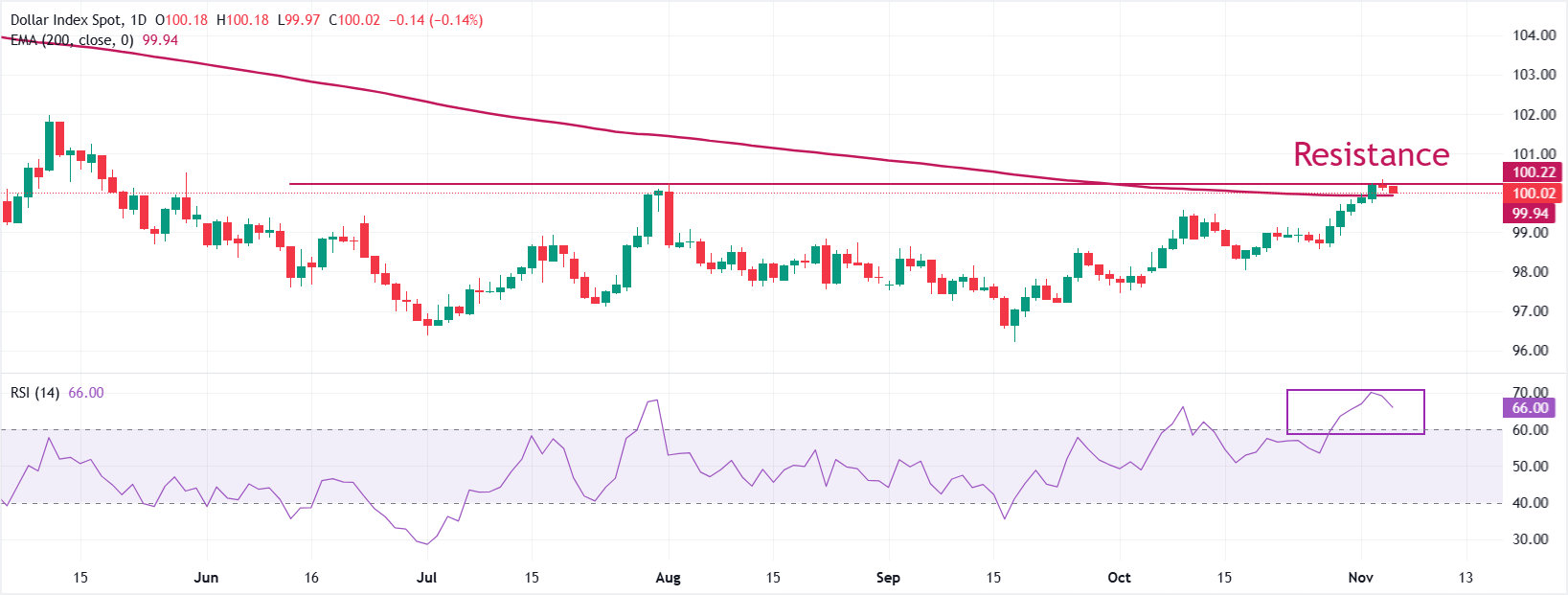 Chỉ số USD đang chật vật kéo dài đà tăng sau khi đạt mức cao nhất trong năm tháng là 100,36 điểm vào thứ Năm. Tài sản này đang nỗ lực ổn định trên đường Trung bình động hàm mũ (EMA) 200 ngày, hiện đang giao dịch quanh mức 99,94.