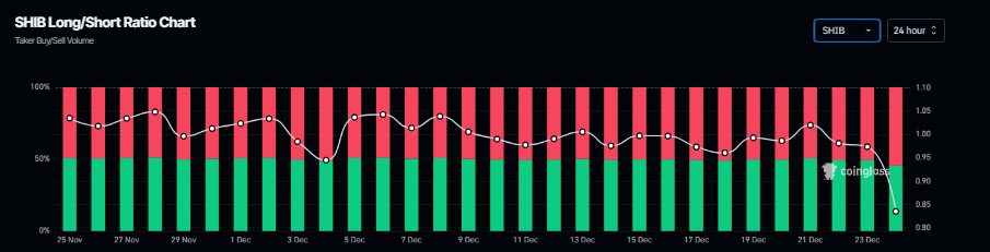 Ngoài ra, tỷ lệ mua/bán khống của SHIB trên Coinglass vào thứ Tư là 0,83, mức cao nhất trong hơn một tháng. Tỷ lệ dưới một cho thấy tâm lý giảm giá trên thị trường, khi ngày càng nhiều nhà giao dịch đặt cược vào việc giá memecoin sẽ giảm.