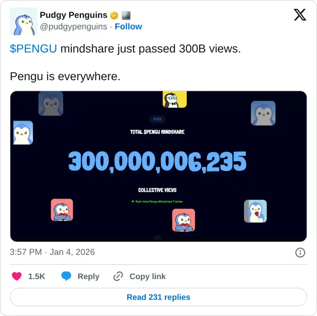 Pudgy Penguins đã đăng tải trên X vào Chủ nhật, tuyên bố rằng mức độ nhận diện thương hiệu của họ đã vượt qua 300 tỷ lượt xem tích lũy trên các mạng xã hội và công cụ theo dõi. Sự tăng trưởng này cho thấy sự quan tâm ngày càng tăng của nhà đầu tư và việc áp dụng token meme, báo hiệu triển vọng tích cực cho PENGU.