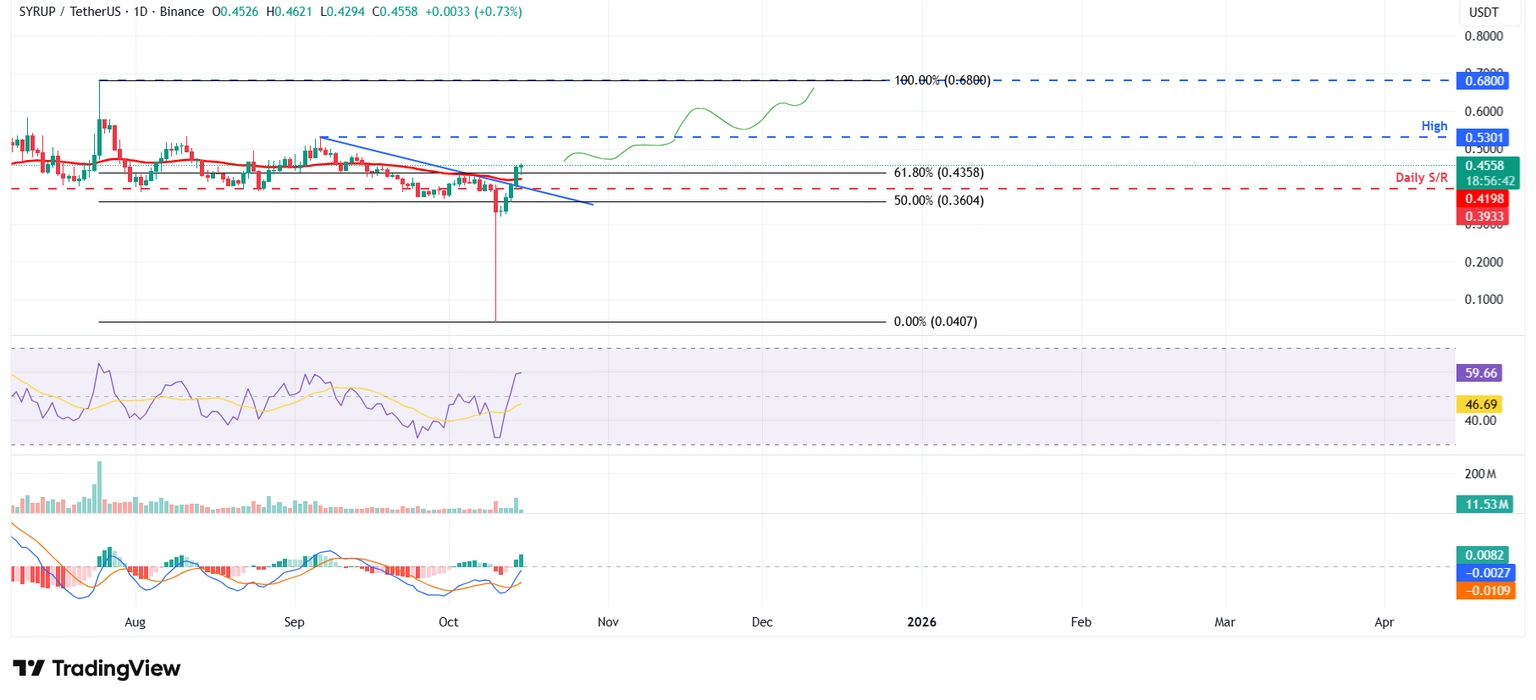 Tuy nhiên, nếu SYRUP gặp phải sự điều chỉnh, giá có thể tiếp tục giảm về mức hỗ trợ hàng ngày là 0,41 đô la.