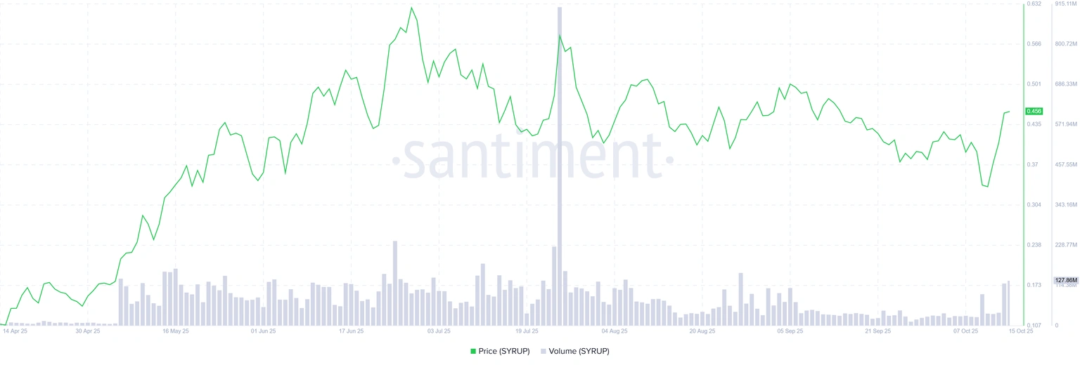 Dữ liệu Santiment cho thấy khối lượng giao dịch của hệ sinh thái SYRUP (tổng khối lượng giao dịch được tạo ra bởi tất cả các ứng dụng giao dịch trên chuỗi) đã đạt 127,86 triệu đô la vào thứ Tư, mức cao nhất kể từ cuối tháng 8. Sự gia tăng khối lượng này cho thấy sự quan tâm và tính thanh khoản của các nhà giao dịch đối với chuỗi Maple Finance tăng vọt, thúc đẩy triển vọng tăng giá của nó .