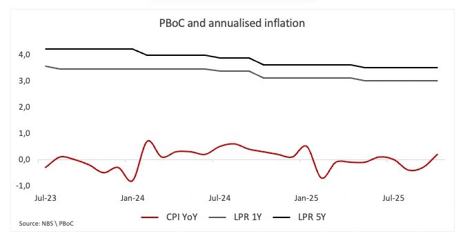 Trong khi đó, Ngân hàng Nhân dân Trung Quốc (PBoC) đã giữ nguyên Lãi suất cho vay cơ bản (LPR) ở mức 3,00% (kỳ hạn một năm) và 3,50% (kỳ hạn năm năm) vào đầu tháng 10, đúng như dự đoán rộng rãi.