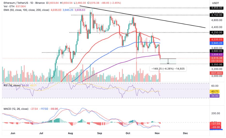 Nếu Ethereum đóng cửa phiên giao dịch dưới ngưỡng hỗ trợ số tròn tại 3.500 đô la, giá có thể giảm 4% xuống 3.350 đô la. Đây là vùng hỗ trợ đã từng được thử nghiệm vào đầu tháng 8. Tuy nhiên, một sự đảo chiều tức thời có thể xảy ra nếu phe mua mua vào khi giá giảm, tiếp tục củng cố lực đẩy để đẩy ETH lên trên đường trung bình động hàm mũ (EMA) 200 ngày ở mức 3.606 đô la.