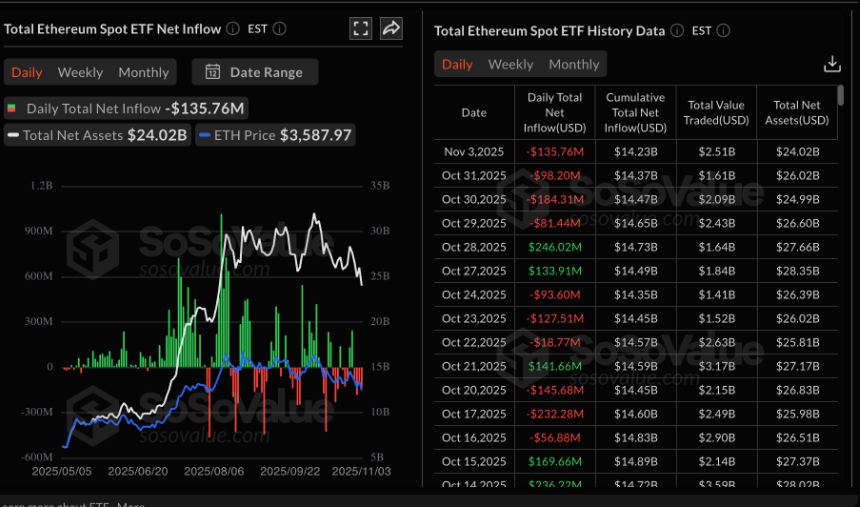Các nhà đầu tư tổ chức đã tạm dừng tìm kiếm cơ hội đầu tư vào các quỹ ETF giao ngay Ethereum. Theo SoSoValue, các quỹ ETF niêm yết tại Hoa Kỳ đã bị rút 136 triệu đô la vào thứ Hai, nâng tổng dòng vốn ròng vào lên 14,23 tỷ đô la và tổng tài sản ròng lên khoảng 24 tỷ đô la.