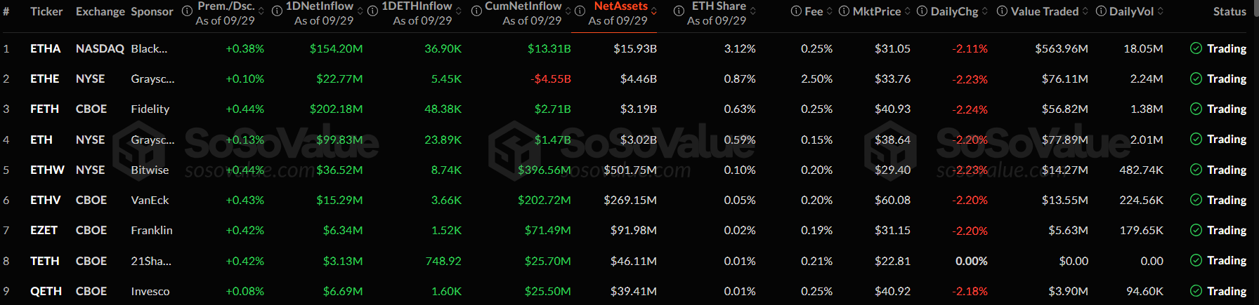 Đáng chú ý, chín sản phẩm này đã chứng kiến dòng vốn đổ vào cùng lúc lần đầu tiên kể từ khi ra mắt vào tháng 7 năm 2024, trong đó Quỹ Ethereum (FETH) của Fidelity và Quỹ tín thác Ethereum iShares (ETHA) của BlackRock dẫn đầu với lần lượt 202,18 triệu đô la và 154,20 triệu đô la.