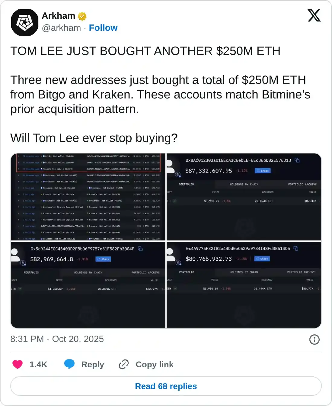 Ngay sau tuyên bố này, dữ liệu từ nền tảng phân tích tiền điện tử Arkham Intelligence cho thấy BitMine đã mua thêm 63.539 ETH vào thứ Hai, mặc dù công ty vẫn chưa xác nhận giao dịch mua này.