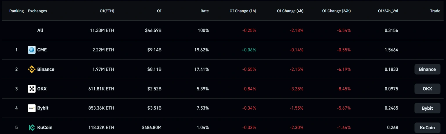 Sự phục hồi nhẹ trong OI phần lớn được thúc đẩy bởi các nhà giao dịch trên Sàn giao dịch hàng hóa Chicago (CME), với số lượng hợp đồng mở của nền tảng này vượt qua Binance để trở thành thị trường phái sinh ETH lớn nhất.
