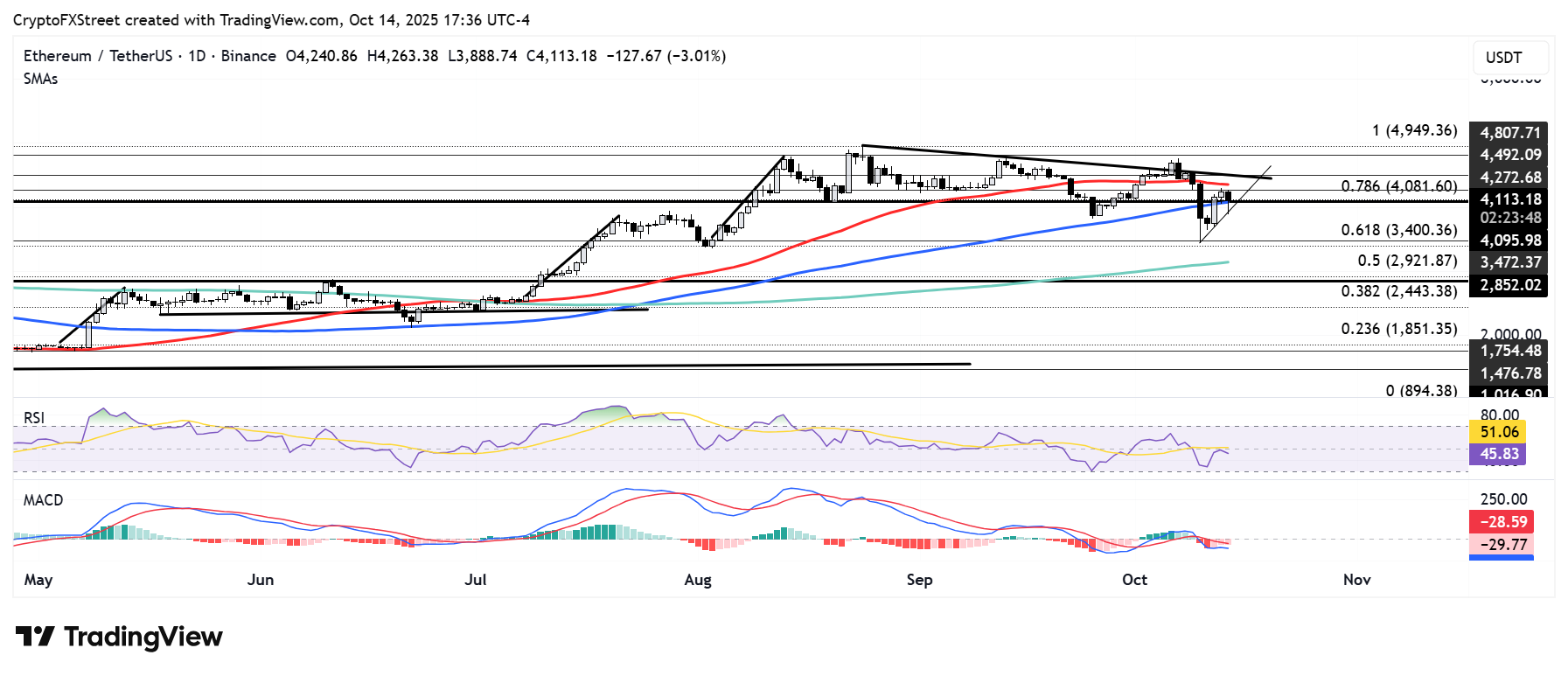 ETH đã giảm xuống dưới mức hỗ trợ 4.100 đô la và đang kiểm tra đường xu hướng tăng kéo dài từ ngày 10 tháng 10. Việc phá vỡ mức này có thể khiến ETH tìm thấy hỗ trợ gần 3.470 đô la.