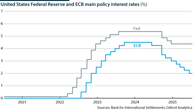 Ngân hàng Trung ương châu Âu (ECB) tiếp tục duy trì lộ trình đã đề ra vào năm 2024 và đã hạ lãi suất tám lần trong khoảng thời gian từ tháng 6 năm 2024 đến tháng 6 năm 2025, giảm lãi suất đối với các hoạt động tái cấp vốn chính, lãi suất đối với cơ chế cho vay cận biên và lãi suất tiền gửi xuống lần lượt là 2,15%, 2,4% và 2%.