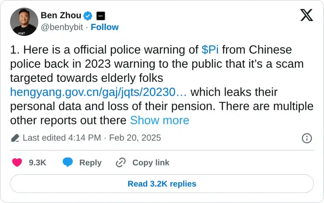 Trong khi đó, sự mập mờ xung quanh Pi Network, do phản hồi chậm trễ và thiếu rõ ràng về lộ trình, cơ chế token và các khía cạnh quan trọng khác, đang khiến người mua tiềm năng và nhu cầu e ngại. Người sáng lập sàn giao dịch Bybit, Ben Zhou, đã công khai gọi dự án Pi Network là một "trò lừa đảo" đồng thời chia sẻ cảnh báo chính thức từ cảnh sát Trung Quốc trong bài đăng trên Twitter về việc ra mắt mainnet của Pi.