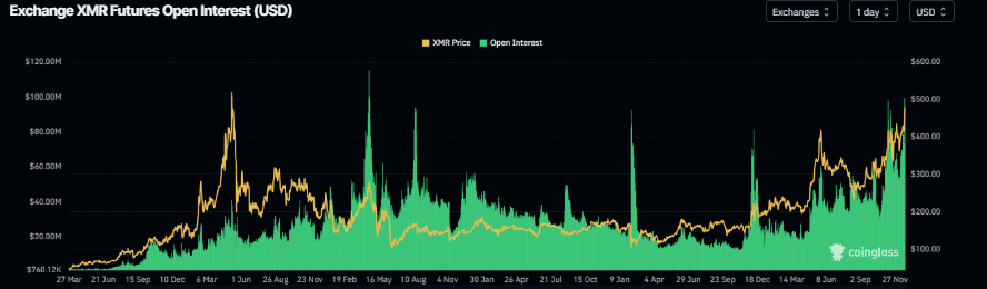 Về thị trường phái sinh, dữ liệu của CoinGlass cho thấy khối lượng giao dịch mở (OI) hợp đồng tương lai Monero trên các sàn giao dịch đã tăng vọt lên 99,70 triệu đô la vào Chủ nhật, tăng từ 54,01 triệu đô la vào ngày 10 tháng 12, và hiện đang ở mức 95,42 triệu đô la. Sự gia tăng OI thể hiện dòng tiền mới hoặc bổ sung đổ vào thị trường và hoạt động mua vào mới, điều này có thể thúc đẩy đà tăng giá hiện tại của XMR.