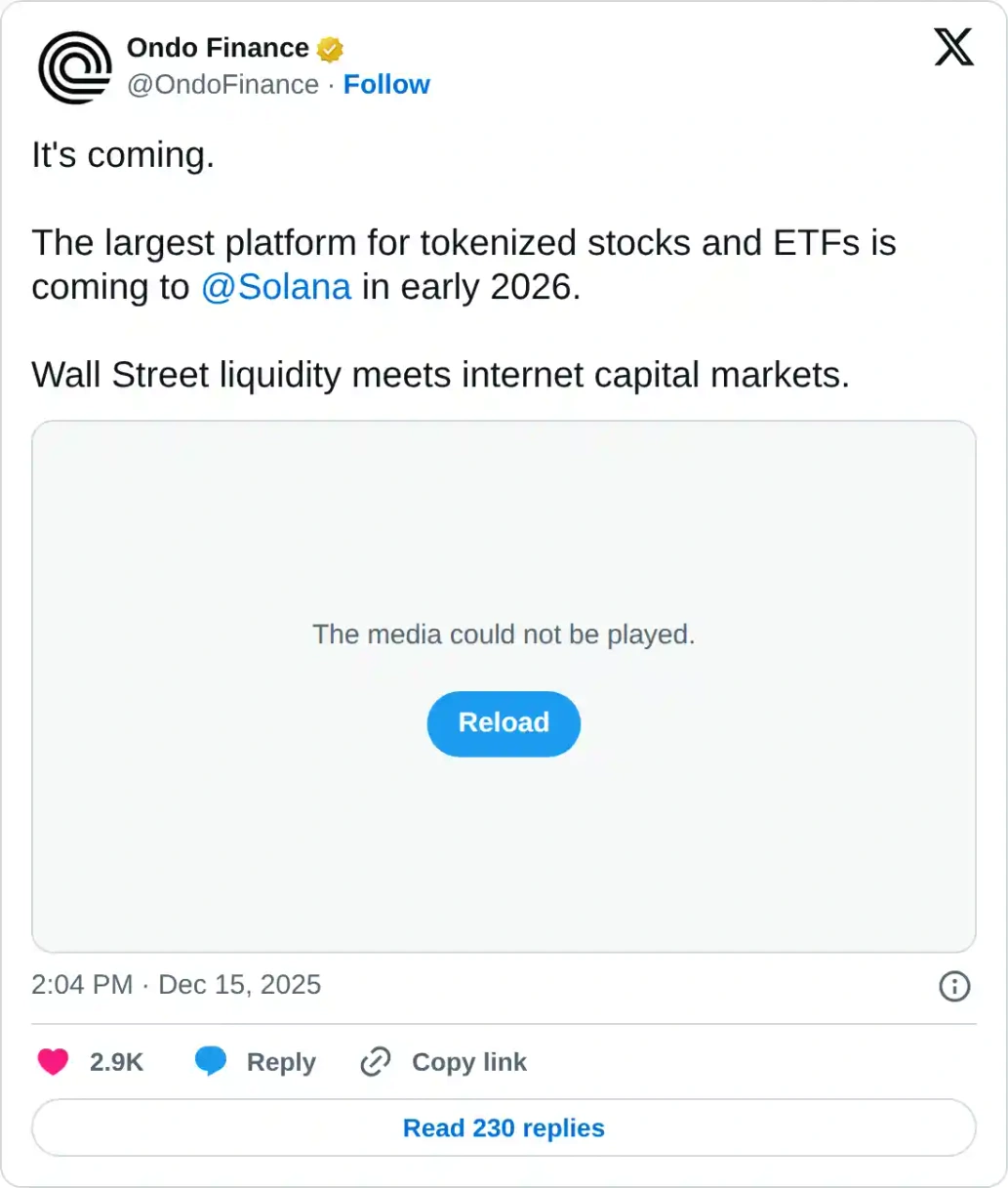 ONDO Finance đã thông báo trên tài khoản X của mình vào thứ Hai rằng họ có kế hoạch tích hợp với Solana vào đầu năm 2026, đưa nền tảng hàng đầu của mình về cổ phiếu và ETF được mã hóa dưới dạng token lên mạng lưới này.