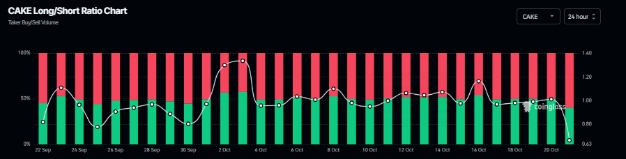 Về phía phái sinh, tỷ lệ mua/bán của Coinglass đối với CAKE là 0,66 vào thứ Ba, mức thấp nhất trong một tháng. Tỷ lệ dưới đây cho thấy tâm lý bi quan, cho thấy người nắm giữ đang đặt cược vào việc giá tài sản sẽ giảm.
