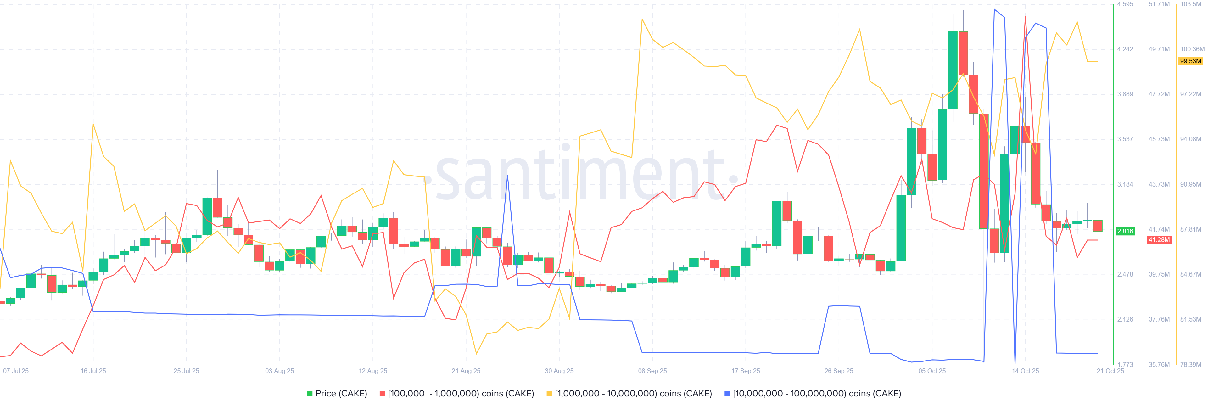 Dữ liệu phân phối cung ứng của Santiment tiếp tục ủng hộ triển vọng giảm giá đối với CAKE, vì số lượng người nắm giữ ví lớn (cá voi) đang giảm dần.