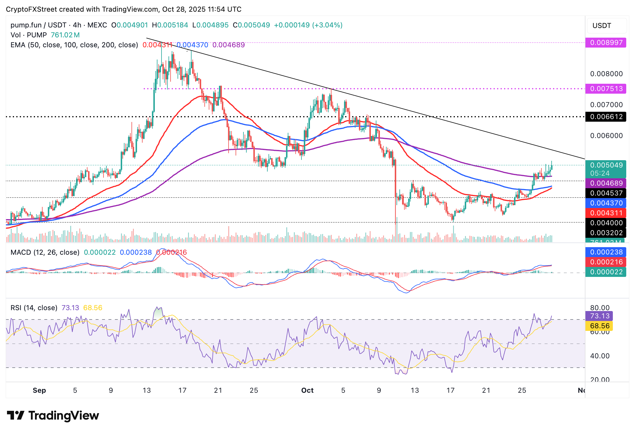 - Pump.fun mở rộng đà phục hồi trên mức 0,0050 đô la, được hỗ trợ bởi nhu cầu chấp nhận rủi ro ngày càng tăng.