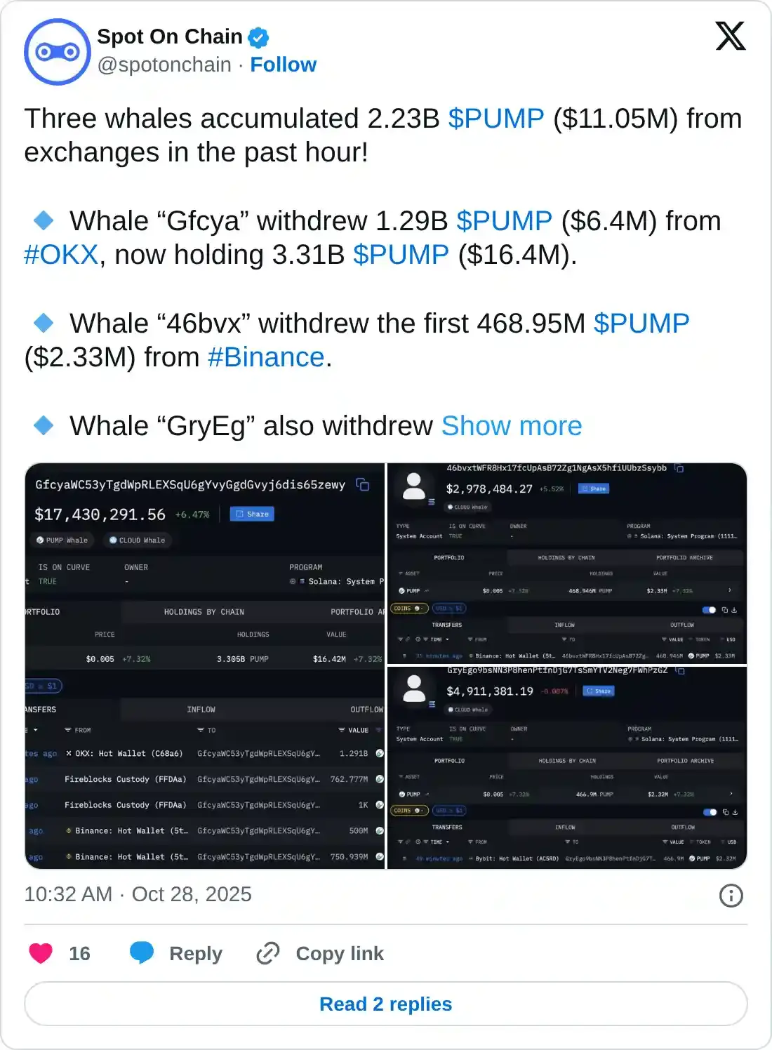 Cá voi đầu tiên đã rút 1,29 tỷ PUMP, trị giá khoảng 6,4 triệu đô la, khỏi sàn giao dịch OKX, nâng tổng số nắm giữ lên 3,31 tỷ PUMP, trị giá 16,4 triệu đô la.