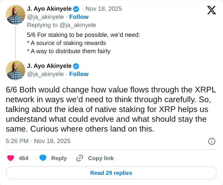 Akinyele lập luận rằng việc ra mắt Quỹ Giao dịch Trao đổi (ETF) Canary XRP tuần trước là một dấu hiệu cho thấy việc áp dụng đang tăng lên, được hỗ trợ bởi nhu cầu của các tổ chức. Tuy nhiên, trước tiên, giao thức này phải tìm ra cách tạo ra phần thưởng staking và phân phối chúng một cách công bằng. Trưởng bộ phận Kỹ thuật tại RippleX cho biết thêm rằng việc staking gốc trên XRP Ledger có thể là bước tiếp theo.