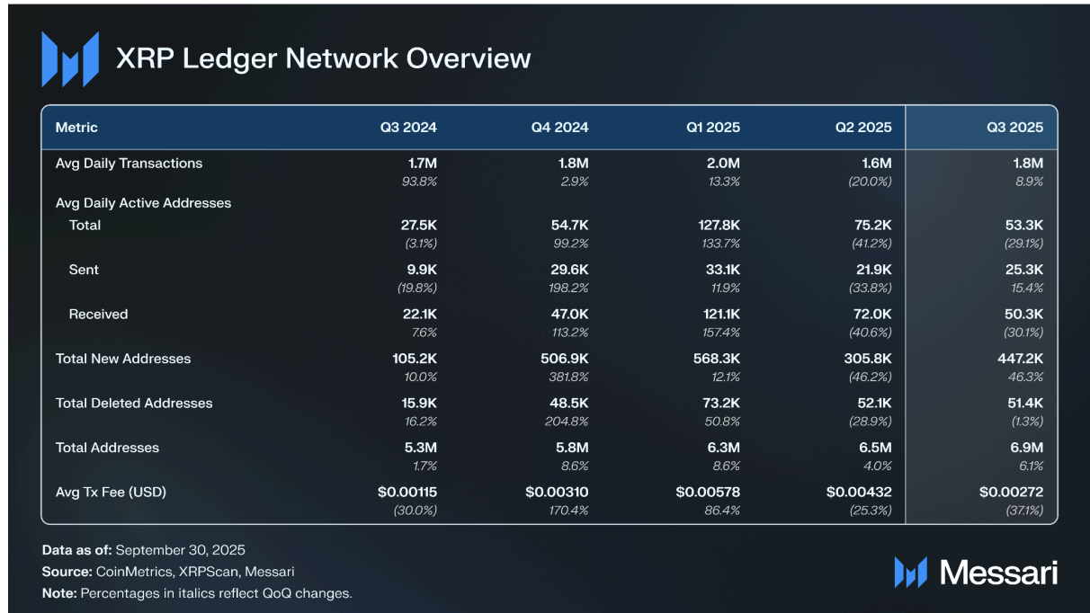 Messari cũng nhấn mạnh mức tăng 8,9% theo quý trong quý 3 về số lượng giao dịch trung bình hàng ngày trên XRP Ledger (XRPL), từ 1,6 triệu lên 1,8 triệu. Số lượng địa chỉ hoạt động hàng ngày tăng 15,4% theo quý, từ 21.900 lên 25.300, trong khi tổng số địa chỉ mới tăng 46,3% lên 447.200.