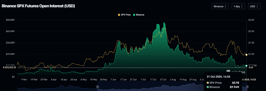 Hợp đồng tương lai mở của Coinglass dành cho đồng tiền meme SPX giảm xuống còn 9,94 triệu đô la vào thứ Ba, so với mức 18,96 triệu đô la vào ngày 7 tháng 10. Mức giảm OI này, liên tục giảm kể từ tháng 7, báo hiệu sự suy giảm trong việc tham gia của nhà đầu tư và củng cố thêm tâm lý thị trường đang suy yếu đối với đồng tiền meme SPX.