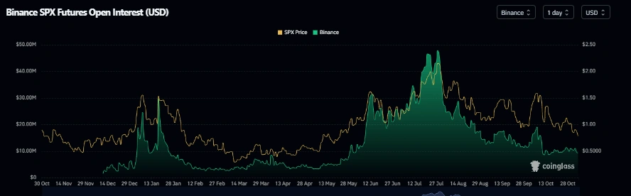 Hợp đồng tương lai mở của Coinglass dành cho đồng tiền meme SPX giảm xuống còn 9,30 triệu đô la vào thứ Hai, so với mức 18,96 triệu đô la vào ngày 7 tháng 10. Mức giảm OI này, vốn đã giảm kể từ tháng 7, báo hiệu sự suy giảm trong việc tham gia của nhà đầu tư và củng cố thêm tâm lý thị trường đang suy yếu đối với đồng tiền meme SPX.