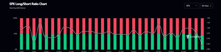 Chỉ số phái sinh cho SPX6900 cho thấy xu hướng giảm. Tỷ lệ mua/bán của CoinGlass đối với SPX là 0,83 vào thứ Hai, mức thấp nhất trong hơn một tháng, làm tăng tỷ lệ cược giảm giá trong giới giao dịch.