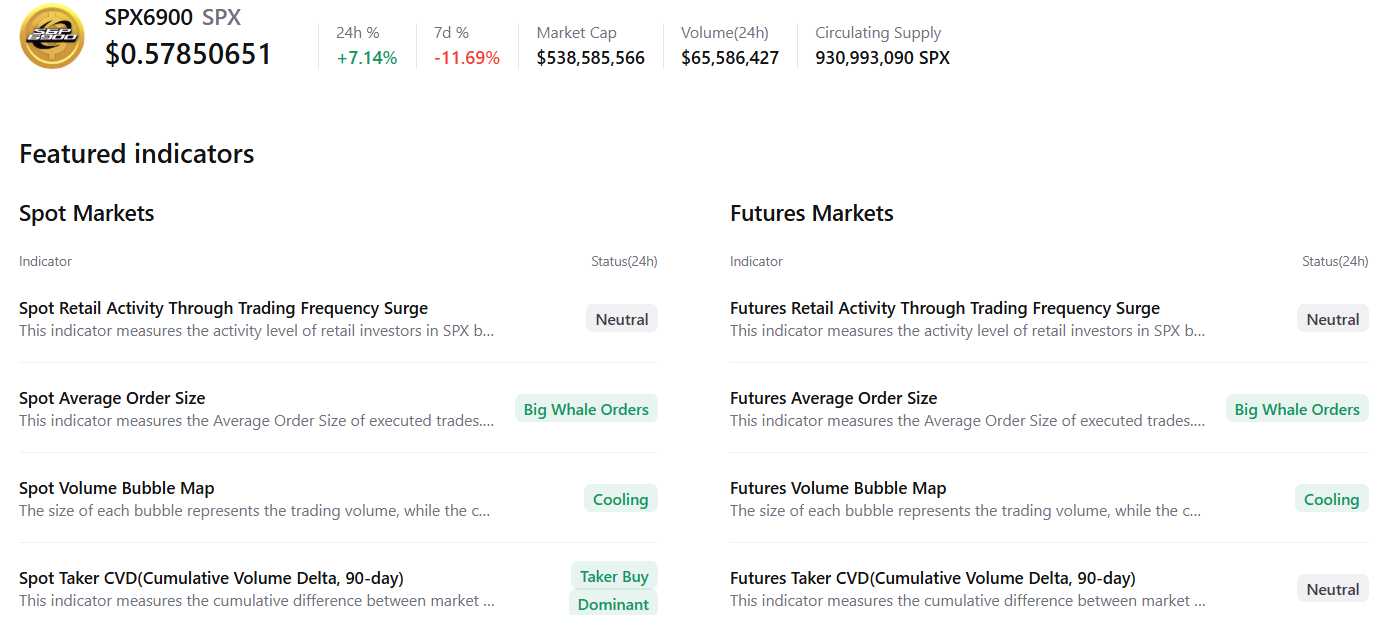 Giá SPX6900 (SPX) đang giữ ở mức gần 0,58 đô la tại thời điểm viết bài vào thứ Năm sau khi phục hồi từ vùng hỗ trợ quan trọng vào đầu tuần. Dữ liệu on-chain và các sản phẩm phái sinh cho thấy điều kiện thị trường đang được củng cố