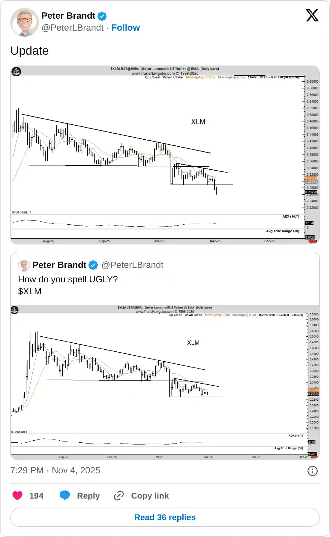- Nhà phân tích Peter Brandt chia sẻ phân tích về mô hình tam giác giảm dần của XLM, cho thấy giai đoạn điều chỉnh kéo dài đang diễn ra.