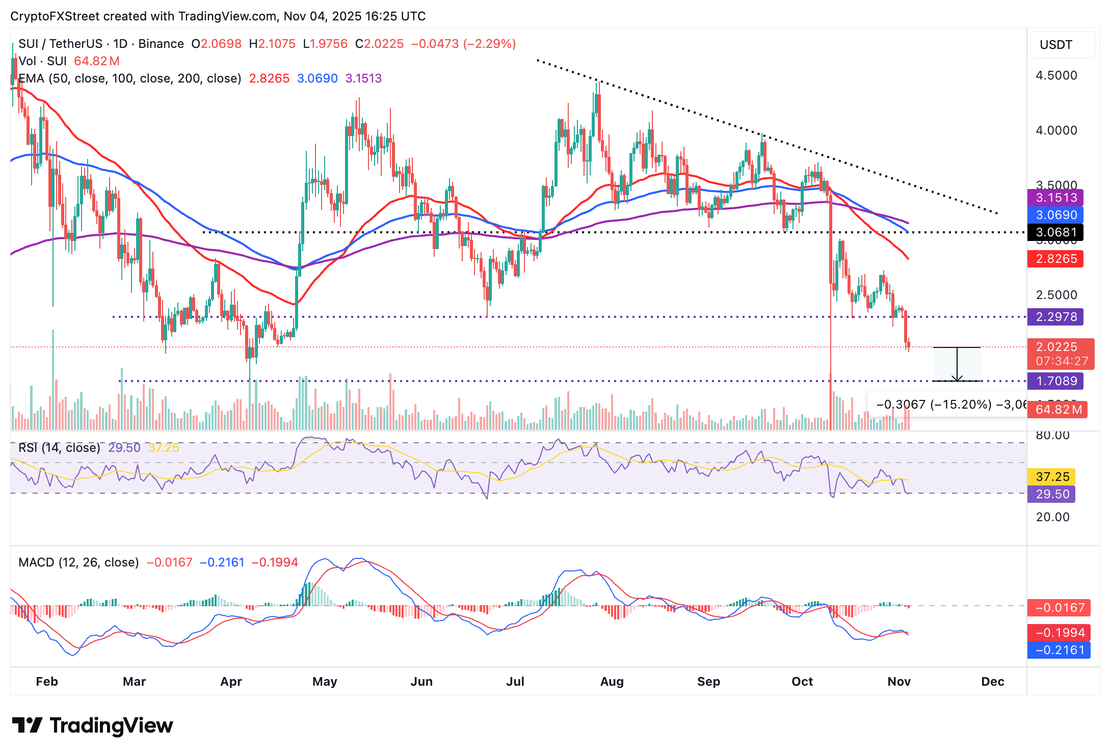 Cấu trúc kỹ thuật của Sui báo hiệu sẽ còn nhiều khó khăn hơn trong những ngày tới nếu ngưỡng hỗ trợ tại $2,00 bị phá vỡ. Chỉ báo Phân kỳ Hội tụ Trung bình Động (MACD) đã xác nhận tín hiệu bán vào thứ Hai, khuyến khích các nhà giao dịch giảm tỷ trọng cổ phiếu, điều này có thể góp phần gây áp lực bán.