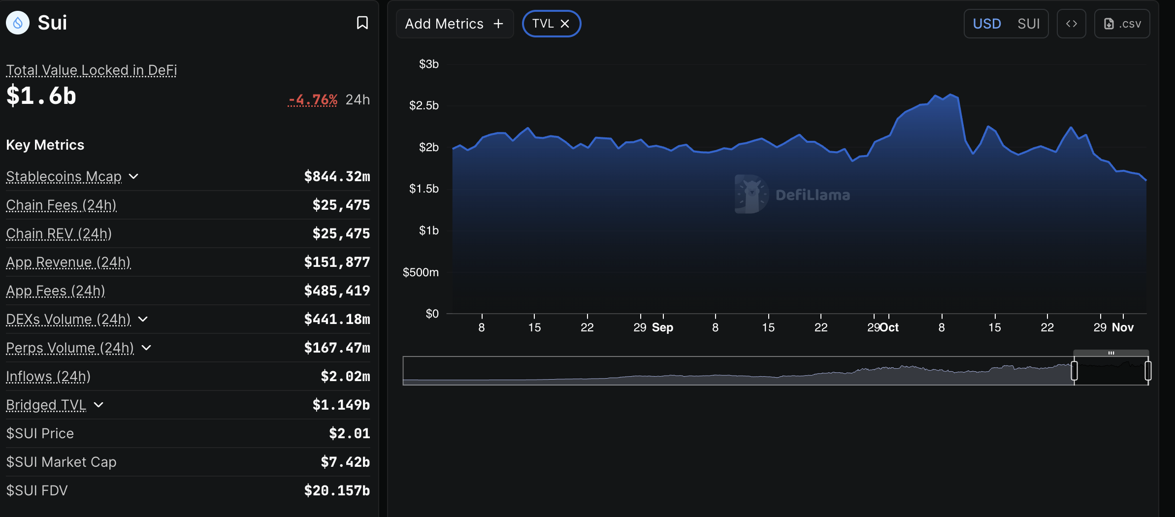 - Mức giảm 5% trong 24 giờ qua khiến TVL DeFi của SUI xuống còn 1,6 tỷ đô la.