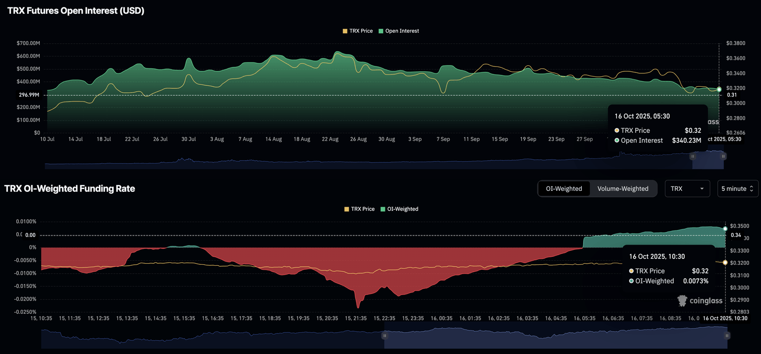 Nhu cầu về Tron tiếp tục biến động, một tác động phụ của biến động chung đang diễn ra trên thị trường. Dữ liệu CoinGlass cho thấy Hợp đồng mở (OI) hợp đồng tương lai TRX liên tục giảm, đạt 340,32 triệu đô la vào thứ Năm. Xu hướng giảm của OI cho thấy những người tham gia thị trường đang lo sợ, dẫn đến việc giảm đòn bẩy hoặc rút vốn.