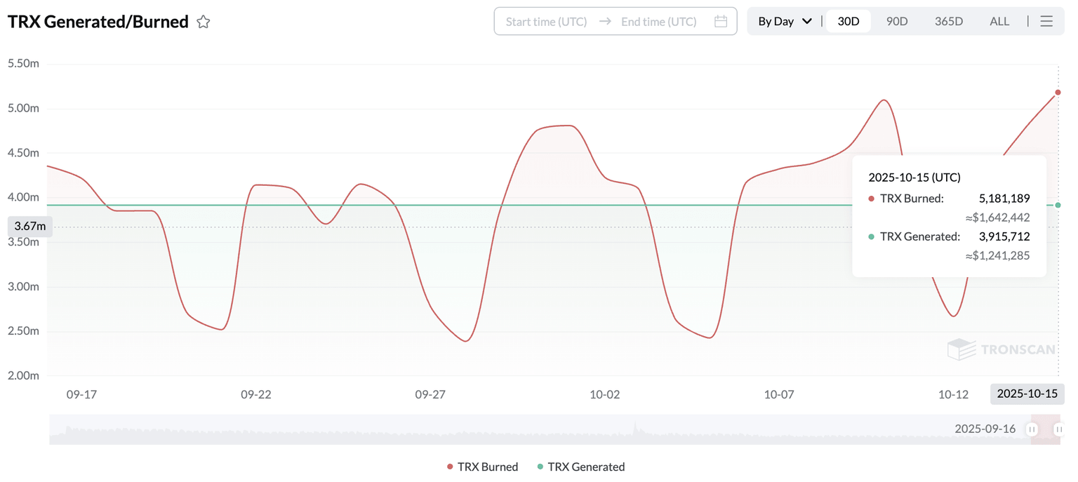 Trong khi đó, tính khả dụng của token gốc Tron đang giảm dần do quá trình đốt vượt quá tốc độ tạo ra TRX. Áp lực giảm phát đang dần gia tăng sau những biến động thị trường gần đây, bằng chứng là việc đốt 5,18 triệu token TRX so với mức tạo ra ổn định là 3,91 triệu token TRX vào thứ Ba. Sự gia tăng ổn định của việc giãn nở có thể dẫn đến sự tăng vọt giá TRX dựa trên logic cung-cầu chung.