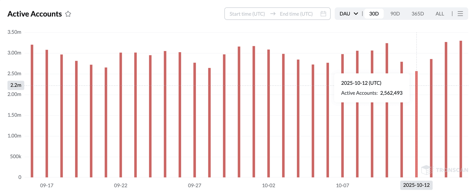 Blockchain Tron đã chứng kiến sự gia tăng ổn định về hoạt động mạng lưới trong 30 ngày qua, thể hiện qua sự gia tăng số lượng tài khoản hoạt động và doanh thu mạng lưới. Theo dữ liệu của TronScan, số lượng tài khoản hoạt động trung bình đạt khoảng 3 triệu trong 30 ngày qua.
