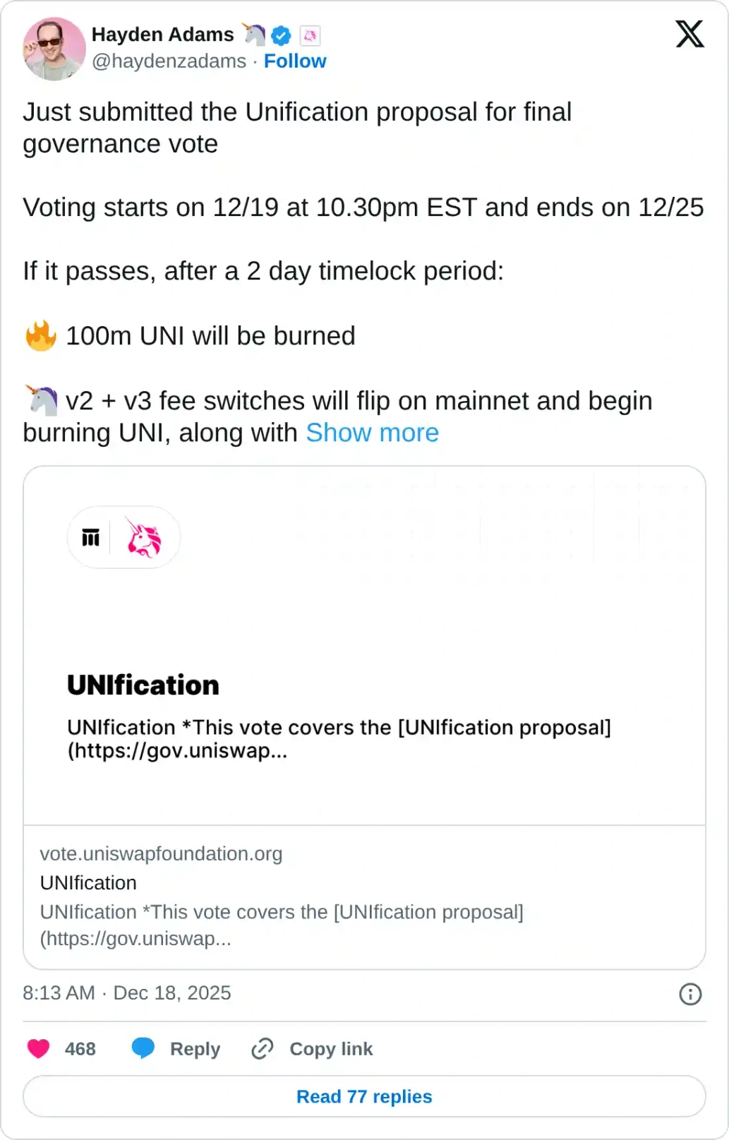 Hayden Adams, đồng sáng lập của Uniswap, cho biết thông qua X rằng quá trình bỏ phiếu, bắt đầu từ thứ Sáu và kết thúc vào ngày 25 tháng 12, có thể mở đường cho hàng loạt thay đổi trên mạng lưới, bao gồm cả việc đốt 100 triệu UNI.