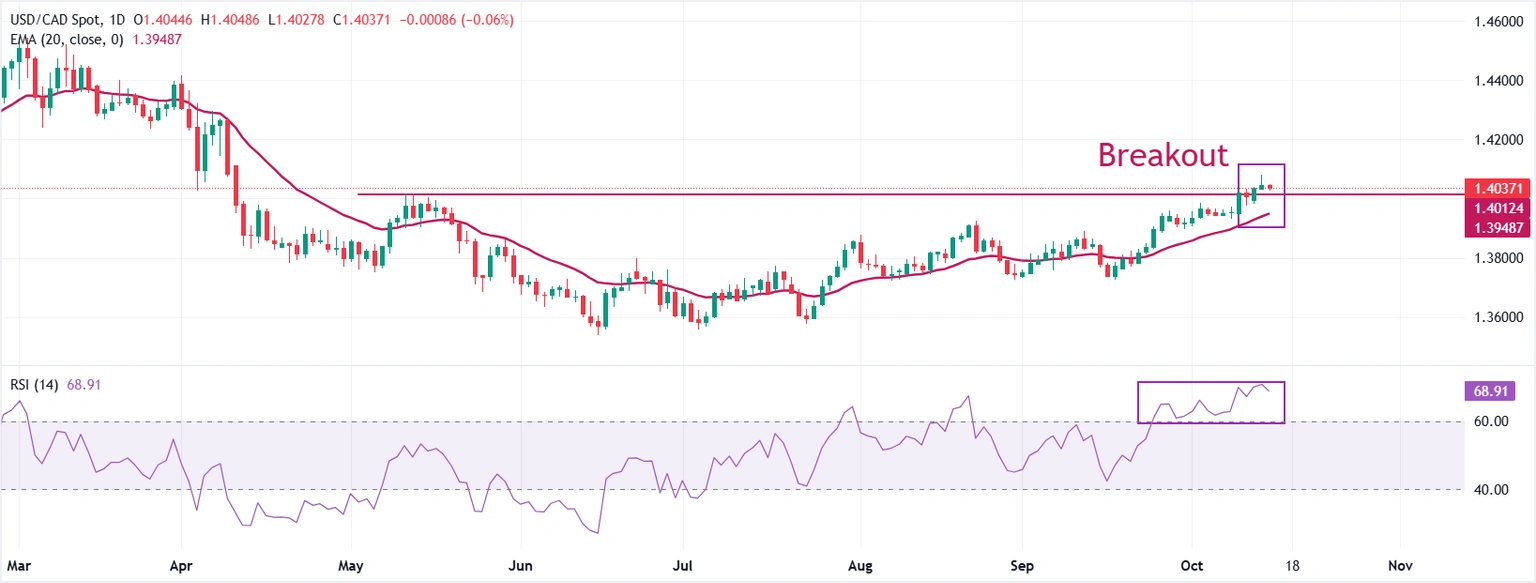 USD/CAD giao dịch trong phạm vi giao dịch của ngày thứ Ba quanh mức 1,4040. Xu hướng ngắn hạn của cặp tiền này vẫn là tăng giá khi Đường trung bình động hàm mũ (EMA) 20 ngày tăng lên quanh mức 1,3950.