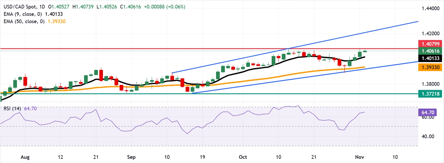 USD/CAD tiếp tục tăng phiên thứ tư liên tiếp, giao dịch quanh mức 1,4060 trong giờ giao dịch châu Âu hôm thứ Ba. Phân tích kỹ thuật trên biểu đồ hàng ngày cho thấy xu hướng tăng giá đang chiếm ưu thế, với cặp tiền này di chuyển lên trên trong mô hình kênh tăng dần.
