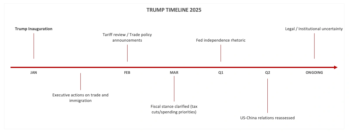 Và rồi còn có yếu tố Trump: Chính trị ít có vai trò là động lực định hướng rõ ràng cho đồng Đô la, mà lại đóng vai trò là nguồn gây ra biến động liên tục. Như biểu đồ thời gian bên dưới cho thấy, các giai đoạn bất ổn chính sách hoặc địa chính trị thường là những thời điểm mà đồng tiền này được hưởng lợi từ vai trò trú ẩn an toàn của nó.