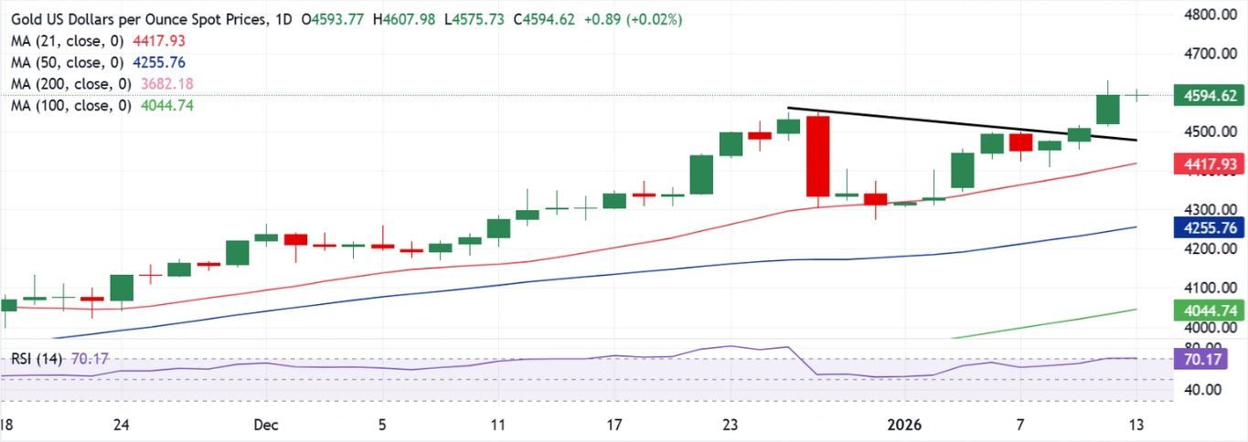 Trên biểu đồ ngày, XAU/USD đang giao dịch ở mức 4.594,62 USD. Đường trung bình động đơn giản (SMA) 21 ngày đã vượt lên trên các đường SMA 50, 100 và 200 ngày, báo hiệu đà tăng mạnh, và giá đang giữ vững trên tất cả các đường này để củng cố tín hiệu tích cực. Chỉ số sức mạnh tương đối (RSI) 14 ngày ở mức 70,17 (quá mua), có thể báo hiệu sự tạm dừng hoặc điều chỉnh giảm nhẹ. Đường SMA 21 ngày ở mức 4.417,93 USD cung cấp mức hỗ trợ động tức thời, và đà tăng sẽ được duy trì khi giá nằm trên mức này.