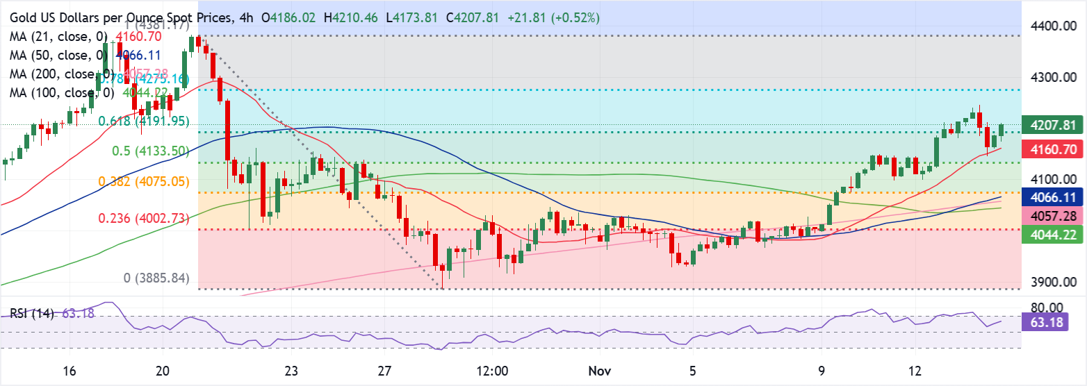 Theo quan sát trên biểu đồ bốn giờ, người mua vàng có vẻ hy vọng khi giá nằm trên Đường trung bình động đơn giản 21 (SMA) ở mức 4.161 đô la.