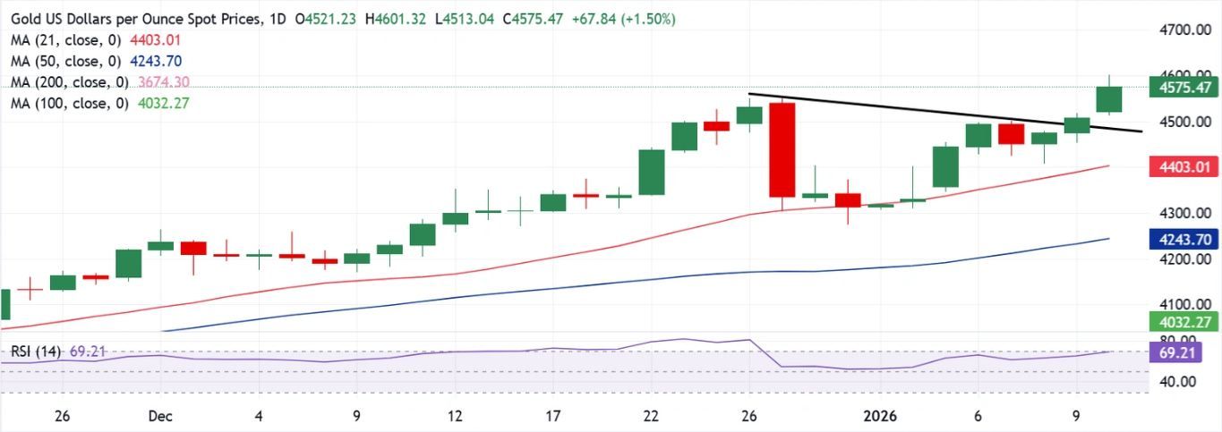 Trên biểu đồ hàng ngày, XAU/USD giao dịch ở mức 4.575,47 USD. Đường trung bình động đơn giản (SMA) 21 và 50 ngày đang tăng và duy trì dưới giá, cho thấy đà tăng mạnh. Các SMA ngắn hơn nằm trên các SMA 100 và 200 ngày, với tất cả các đường dốc đều tăng và người mua đang kiểm soát. SMA 21 ngày ở mức 4.403,01 USD cung cấp mức hỗ trợ động gần đó. Chỉ số sức mạnh tương đối (RSI) (14) đạt 69 (gần mức quá mua), phù hợp với đà tăng mạnh; có thể xuất hiện sự tạm dừng nếu nó vượt quá 70. Một đợt giảm giá sẽ nhắm mục tiêu vào SMA 50 ngày ở mức 4.243,70 USD.