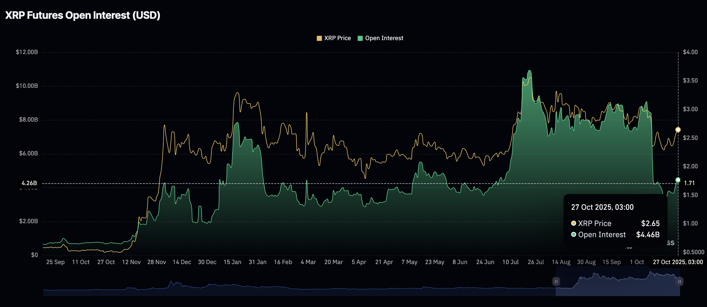 Giá trị hợp đồng tương lai mở (OI) của XRP giảm khoảng 40% xuống còn 4,46 tỷ đô la từ mức 7,43 tỷ đô la vào ngày 1 tháng 10. Mặc dù OI đã cải thiện từ mức thấp hàng tháng là 3,49 tỷ đô la, nhưng mức độ quan tâm chung đối với mã thông báo này vẫn giảm đáng kể so với tháng 7, khi XRP tăng lên mức cao kỷ lục hiện tại là 3,66 đô la.
