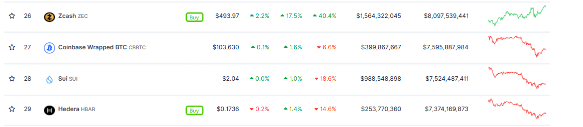 Zcash đã tăng vọt hơn 17% trong tuần này và đang tiến gần đến mốc 500 đô la tại thời điểm viết bài vào thứ Năm. Dữ liệu từ CoinGecko cho thấy vốn hóa thị trường của ZEC đã tăng vọt lên trên 8 tỷ đô la, đưa nó lên vị trí thứ 26 trên thị trường tiền điện tử nói chung và vượt qua các altcoin phổ biến như SUI và HBAR.