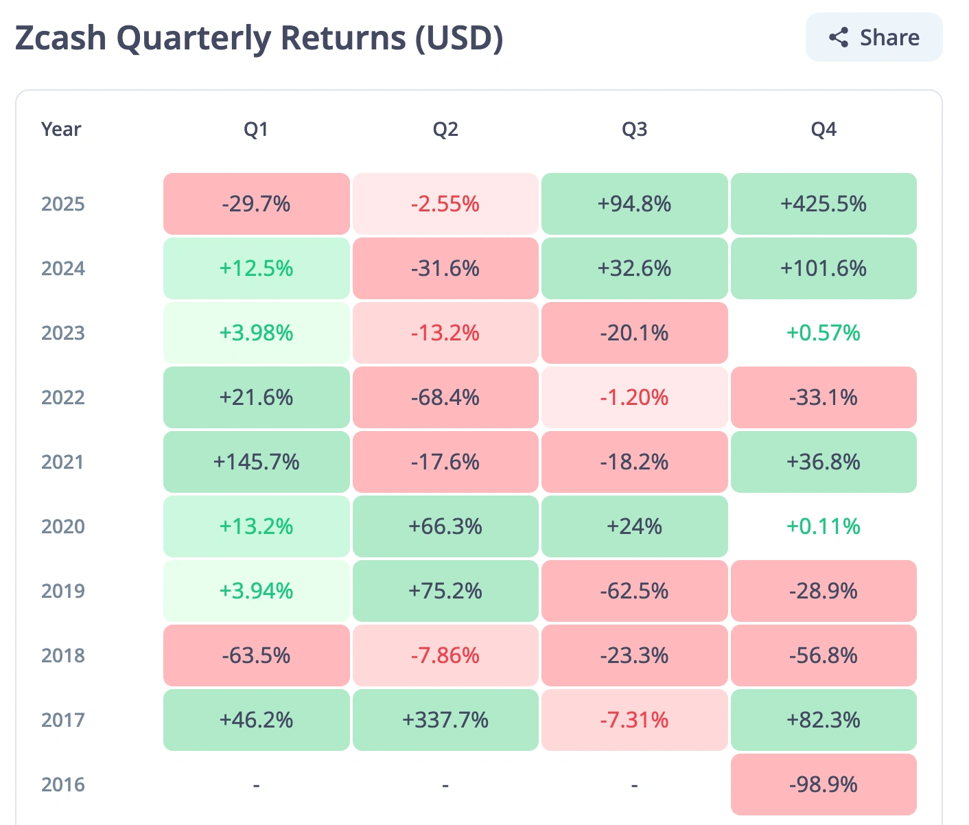 Theo CryptoRank, Zcash vẫn là một trong những đồng tiền điện tử có hiệu suất tốt nhất trong quý IV, tăng gần 425%. Đồng tiền này đã duy trì được hai quý tăng giá liên tiếp, cho thấy sự chuyển dịch có chủ đích sang các blockchain bảo mật.