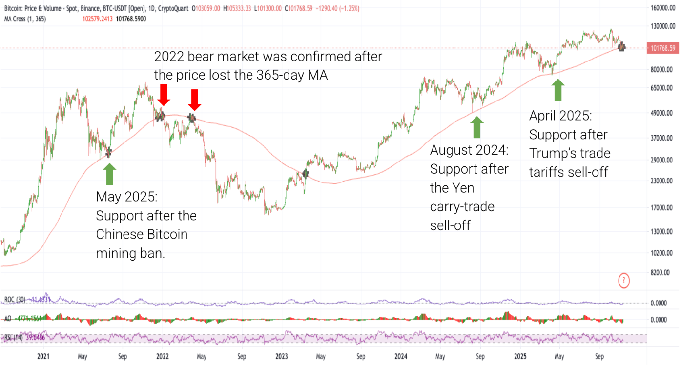 Báo cáo kết luận rằng Đường trung bình động (MA) 365 ngày quanh mức 102.000 đô la là mức hỗ trợ kỹ thuật và tâm lý quan trọng cần theo dõi, vì nó đã đóng vai trò là mức hỗ trợ cho đến nay trong chu kỳ tăng giá này (mũi tên màu xanh lá cây trong biểu đồ bên dưới) và là một trong những tín hiệu cuối cùng được kích hoạt khi thị trường giá xuống bắt đầu vào tháng 12 năm 2021-tháng 1 năm 2022. Việc không thể lấy lại MA 365 ngày có thể đẩy nhanh quá trình điều chỉnh sâu hơn. Đáng chú ý, Bitcoin đã đóng cửa dưới MA 365 ngày nhiều lần trong giai đoạn hiện tại, một hiện tượng chưa từng xảy ra trước đây trong thị trường tăng giá này. Nếu đủ áp lực bán xuất hiện, mức hỗ trợ giá tiếp theo sẽ là dải Giá trị mạng Metcalfe 2x ở mức 91.000 đô la và dải giá tối thiểu của Nhà giao dịch ở mức 72.000 đô la .