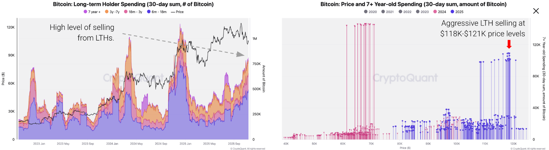 Hơn nữa, những người nắm giữ dài hạn (LTH) đã bán tổng cộng 815.000 BTC trong 30 ngày qua, mức cao nhất kể từ tháng 1 năm 2024, gây thêm áp lực giảm giá. Đợt bán tháo này diễn ra vào thời điểm nhu cầu giao ngay suy yếu/thu hẹp, thể hiện qua dòng tiền rút ròng khỏi các quỹ ETF Bitcoin, mức chênh lệch giá Coinbase âm và nhu cầu rõ ràng giảm. Trong những đợt bán tháo LTH cao trước đây, nhu cầu đã đủ mạnh để hấp thụ nguồn cung này ở mức giá cao hơn, nhưng hiện tại thì không. LTH đã bị bán tháo mạnh ở vùng giá 118.000 đô la và 121.000 đô la.