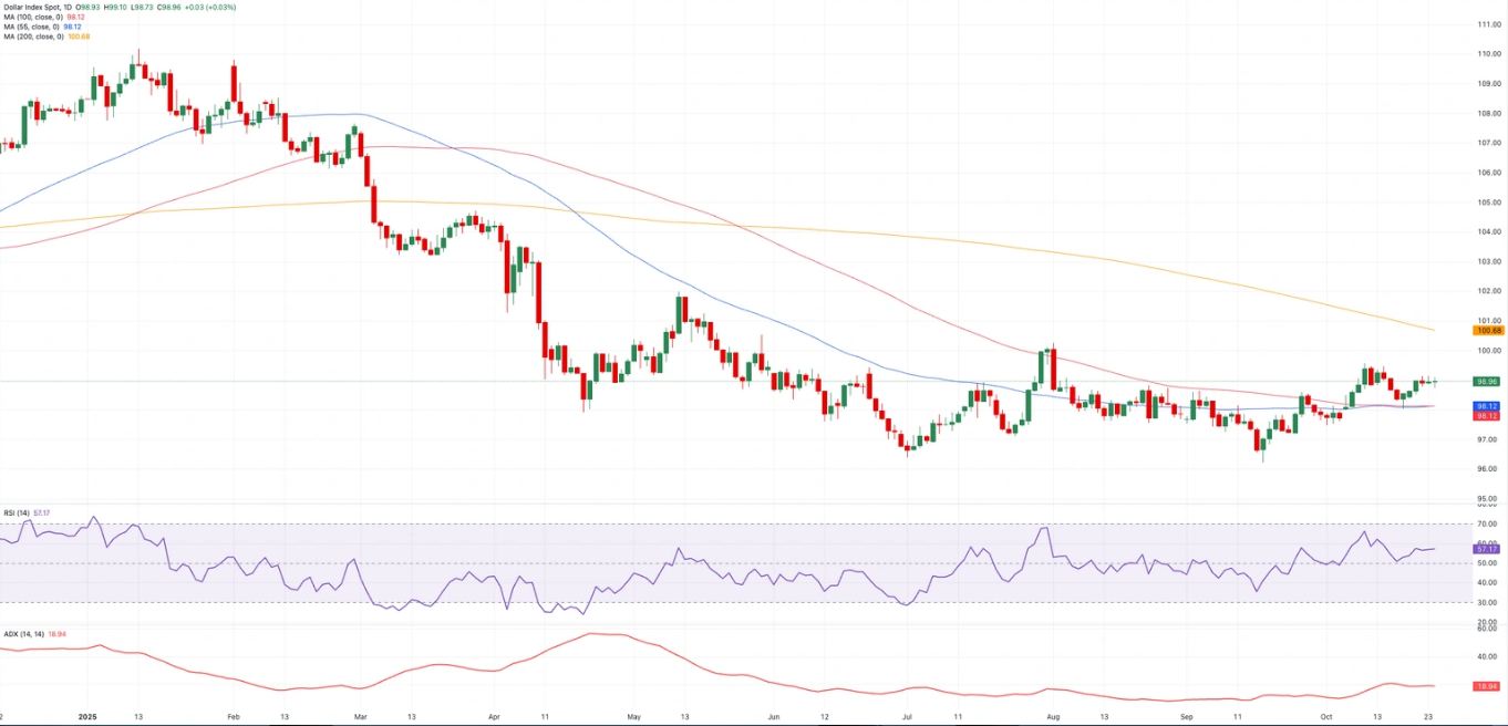 Ngược lại, có một vùng tranh chấp ngay lập tức tại mức thấp hàng tuần là 98,03 (ngày 17 tháng 10). Việc mất mức này cho thấy một đợt thoái lui sâu hơn về đáy năm 2025 là 96,21 (ngày 17 tháng 9), trước mức đáy tháng 2 năm 2022 là 95,13 (ngày 4 tháng 2) và có thể là đáy năm 2022 là 94,62 (ngày 14 tháng 1).