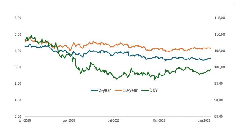 Nhìn về phía nam, mức hỗ trợ đầu tiên nằm ở mức thấp nhất tháng 12 là 97,74. Nếu có một đợt bán tháo mạnh hơn, chỉ số có thể quay trở lại mức đáy năm 2025 ở mức 96,21 (ngày 17 tháng 9). Nếu phá vỡ mức này, nó sẽ gặp mức hỗ trợ sâu hơn ở mức đáy tháng 2 năm 2022 ở mức 95,13, và sau đó là mức đáy năm 2022 ở mức 94,62.