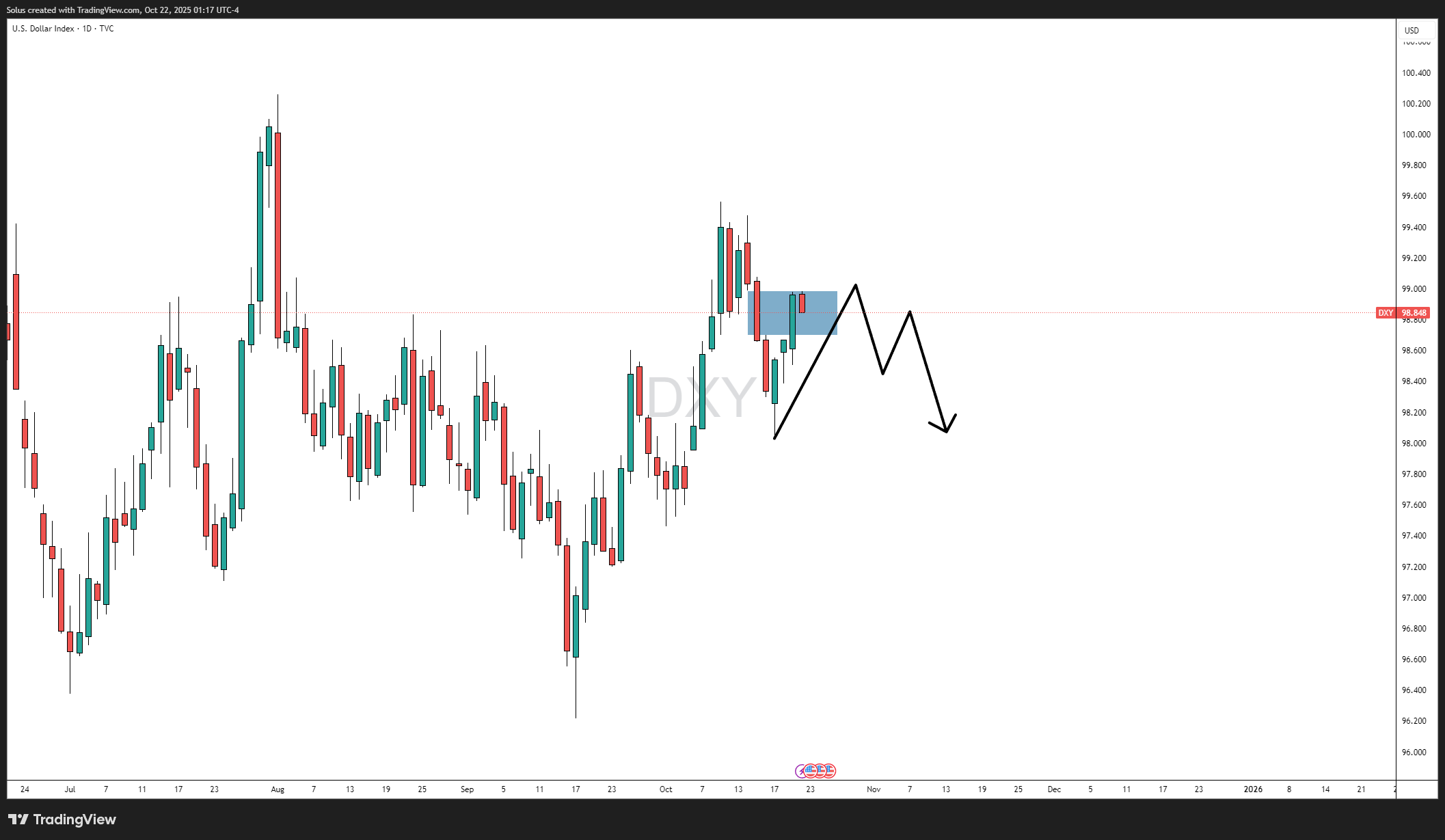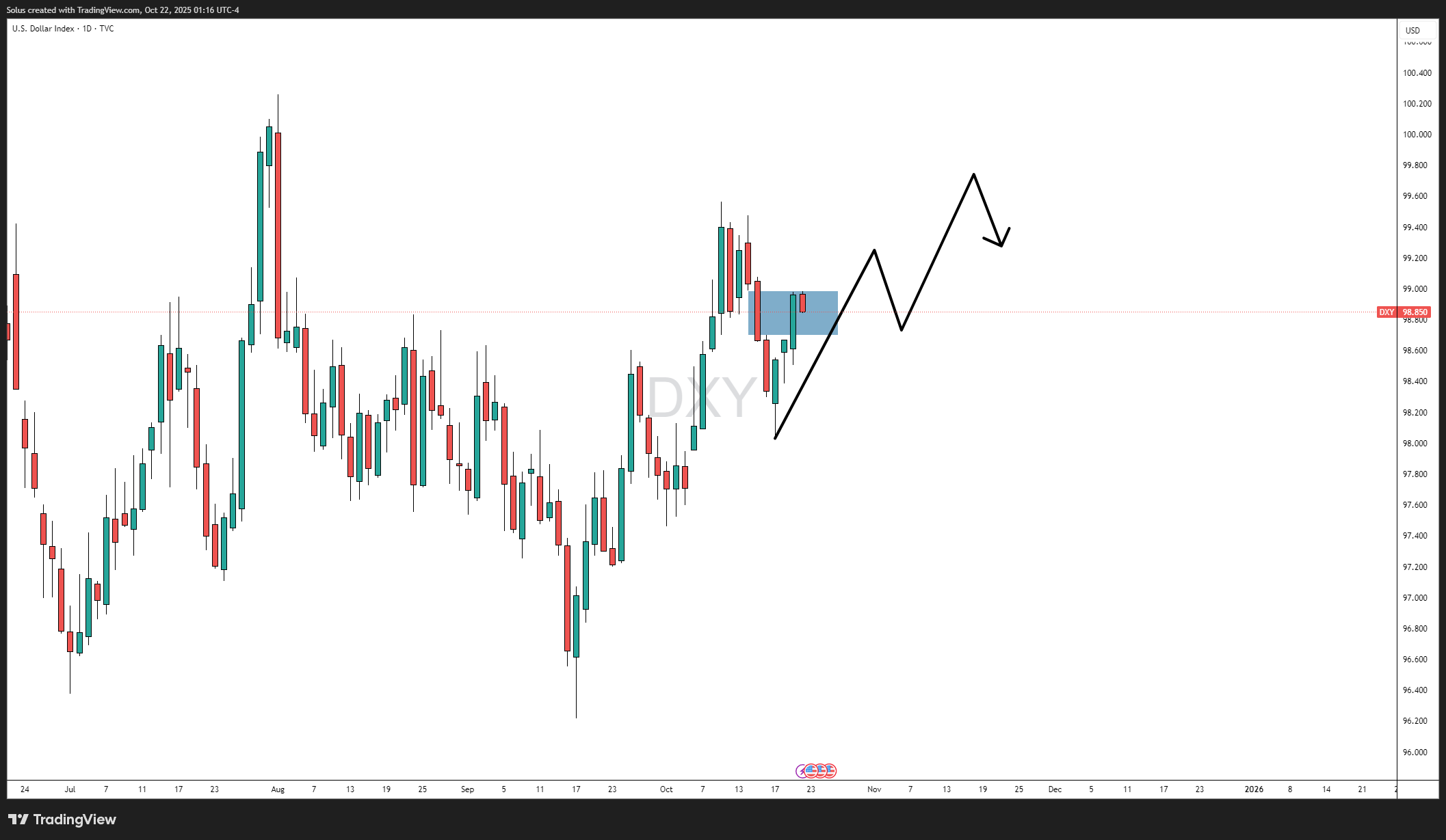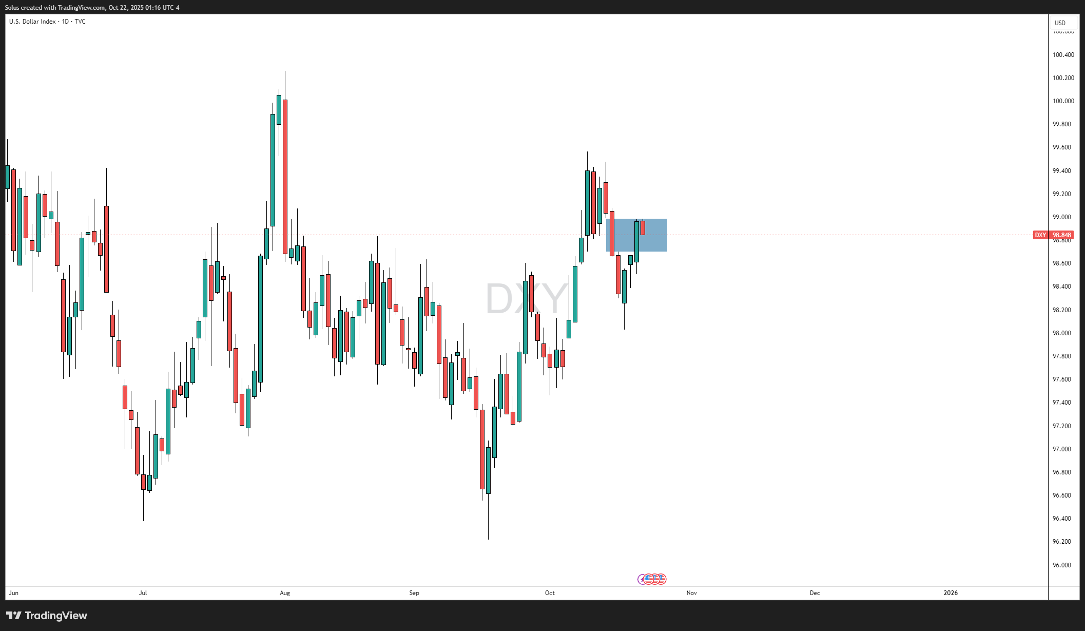 Chỉ số Đô la vẫn bị giới hạn trong phạm vi cân bằng 98,30–99,30 , tạo thành một cấu trúc nén chặt chẽ. Các đợt phục hồi gần đây từ 97,30 cho thấy sức mạnh phòng thủ, nhưng đà tăng đã chững lại.